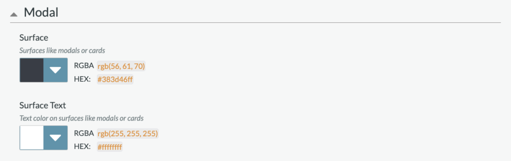 Surface Text: Sets the text color on surfaces like modals or cards, including: