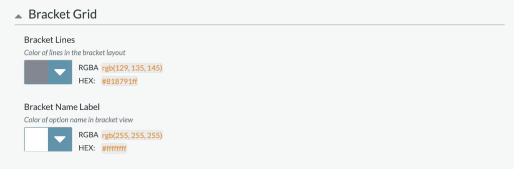 The Color Palettes sub-tab includes the Custom color values for the Bracket Vote application. Each color can be set by clicking the dropdown selection next to the color. The value corresponds with specific elements within the Bracket Vote application. See below the guide for which elements are set by values within the Custom Color Palette:
