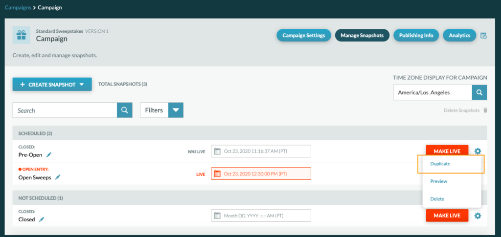 Duplicating a snapshot makes an exact copy of the original snapshot, without the scheduling. This tool is useful when wanting to schedule small changes or divide entry periods for reporting.