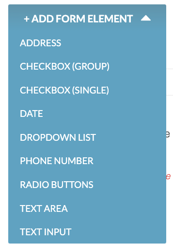 Add Form Elements: To add more fields, click on the drop down labeled +Add Form Elements. Choose the type of response option for acquiring information and fill out the question and predetermined answer choices if necessary. Each option will ask if the question is required and allow space to write a custom error message if required.