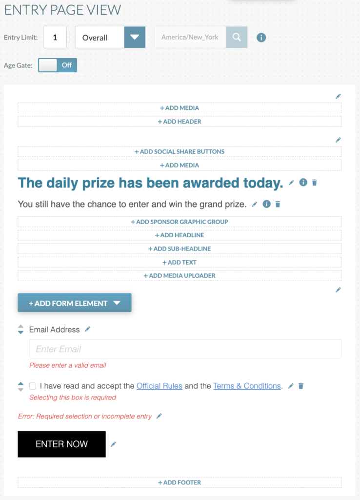 Age Gate: Entries to sweepstakes can be age restricted. If there is a minimum age to enter, turn the Age Gate “on” and enter the age required to enter. If anyone can enter, leave it “off”. If the Age Gate is “on”, the user will need to enter in their date of birth before they can proceed to enter the sweepstakes.
