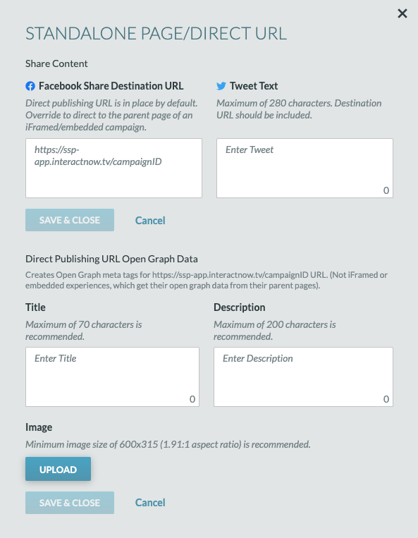 This is where the sharing info for the campaign is set, using open graph tags on the page. Click “Edit Content” to add the FB Share Destination URL (CM autogenerates the CM URL), a generic tweet, as well as a title, description, and image to the metadata.