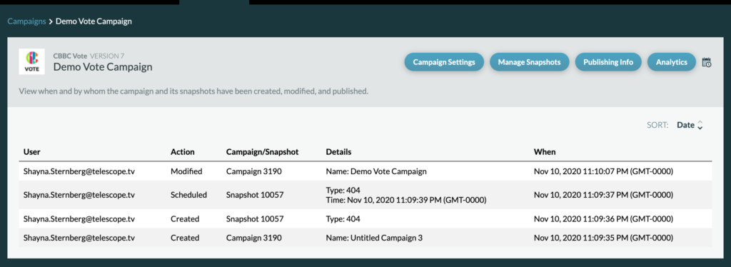 An Audit Page shows when a campaign was created, when a campaign or one of the snapshots within the campaign have been modified or scheduled, and the user who took the action.