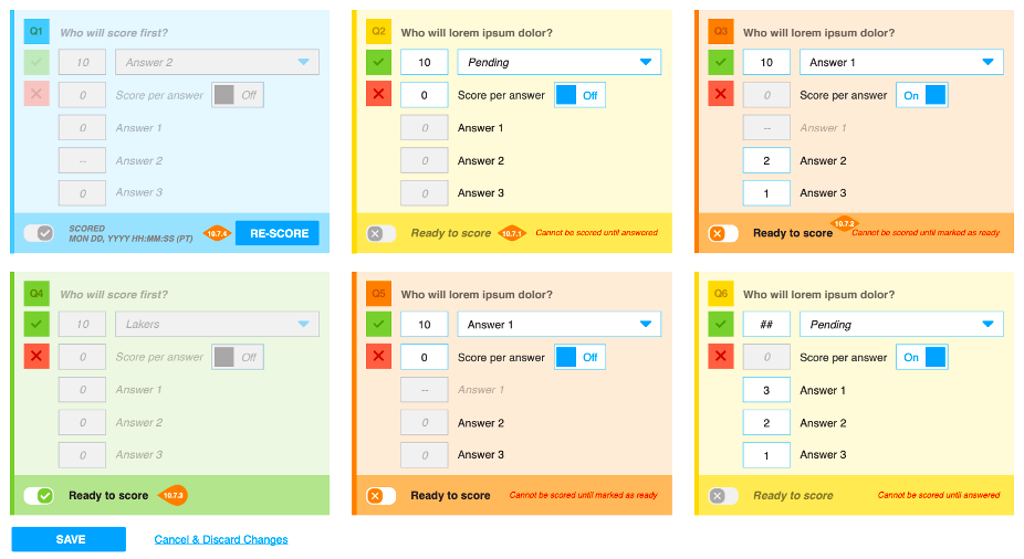 Blue: After a question is scored, the “Ready to Score” toggle becomes disabled. The time at which it was scored is displayed, and a Re-Score button becomes available. Once Re-Score is pressed, the question returns to range state – Answer & Points Assigned, Ready to Score Off.