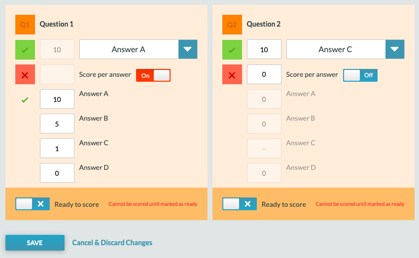 Once points and answers are updated, you will be able to toggle the question to “ready to score” and the question box will then turn green.